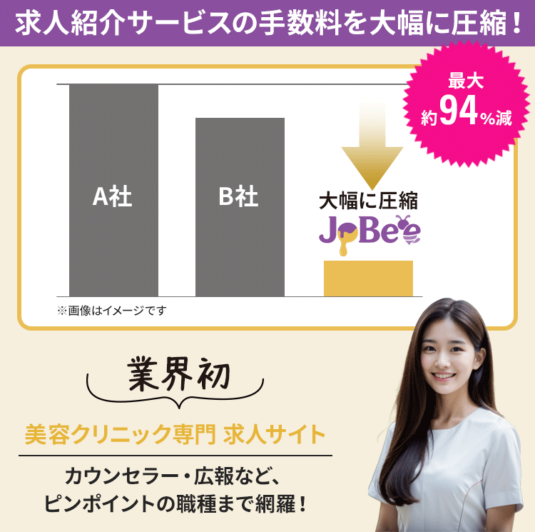 美容クリニックでは、さまざまな職種の人材が活躍しています。 ですが、看護師職を探せるサイトなどは多数あるのに比べて、広報や事務職を探す事のできる求人情報サービスは少なく、探し方がわからない方も多いのではないでしょうか。 JoBee(ジョビー)では、そのような職集や美容クリニックならではの条件で求人情報を掲載できます。「美容クリニックで働きたいのに探し方がわからない」といった求職者の方にこそ、利用しやすいサービスを目指しています。